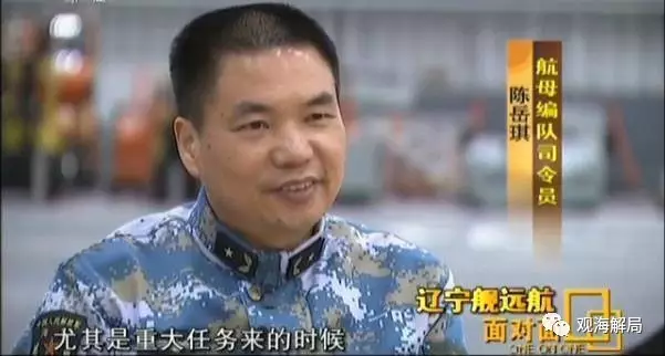 在此次央视专访中,共有三位辽宁舰官兵露面。第一位走进画面的就是辽宁舰航母编队司令员海军少将陈岳琪。